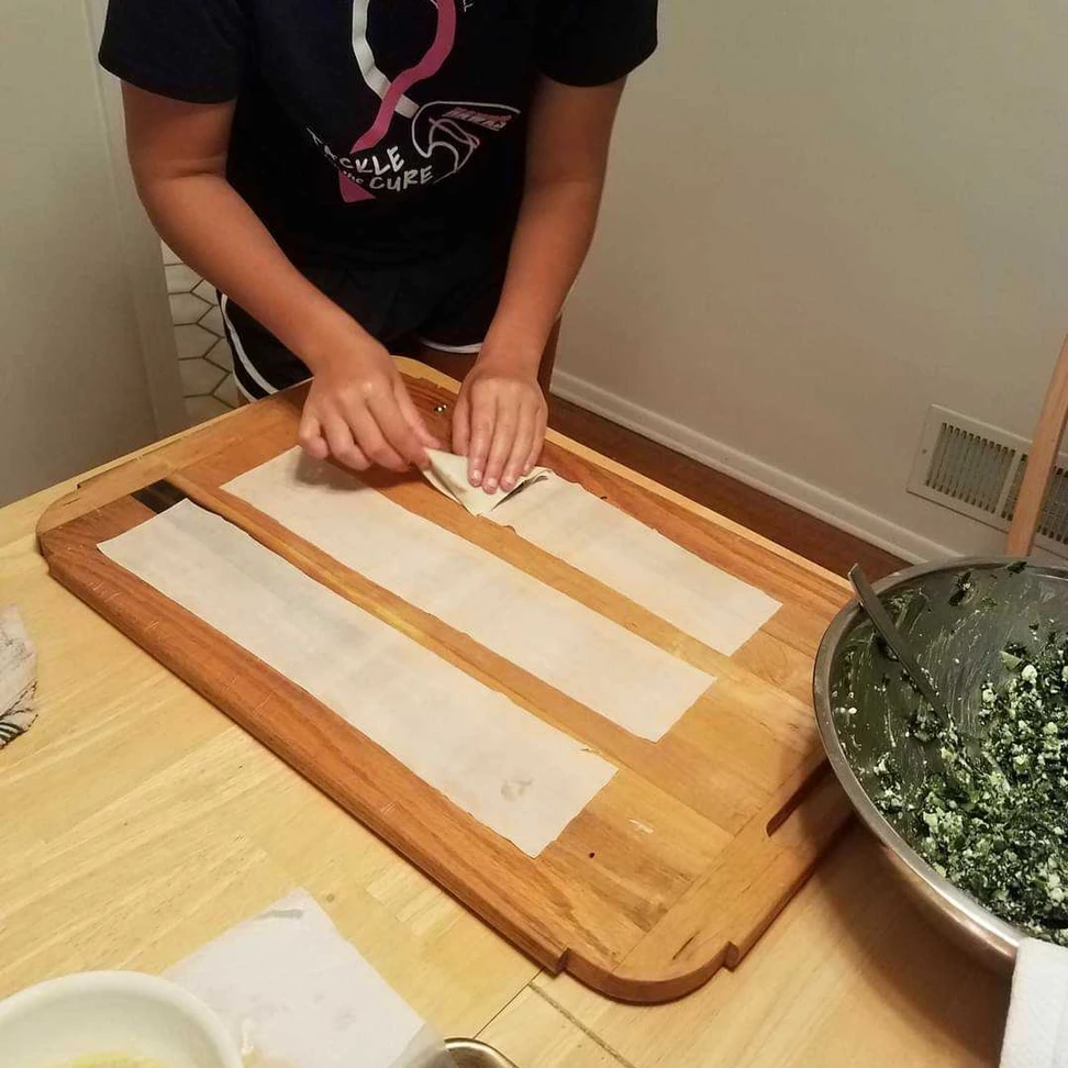 Let the phyllo dough lay flat on a table, and cover with a damp kitchen towel (the dough dries out very easily and can tare, which is why we need it moist).